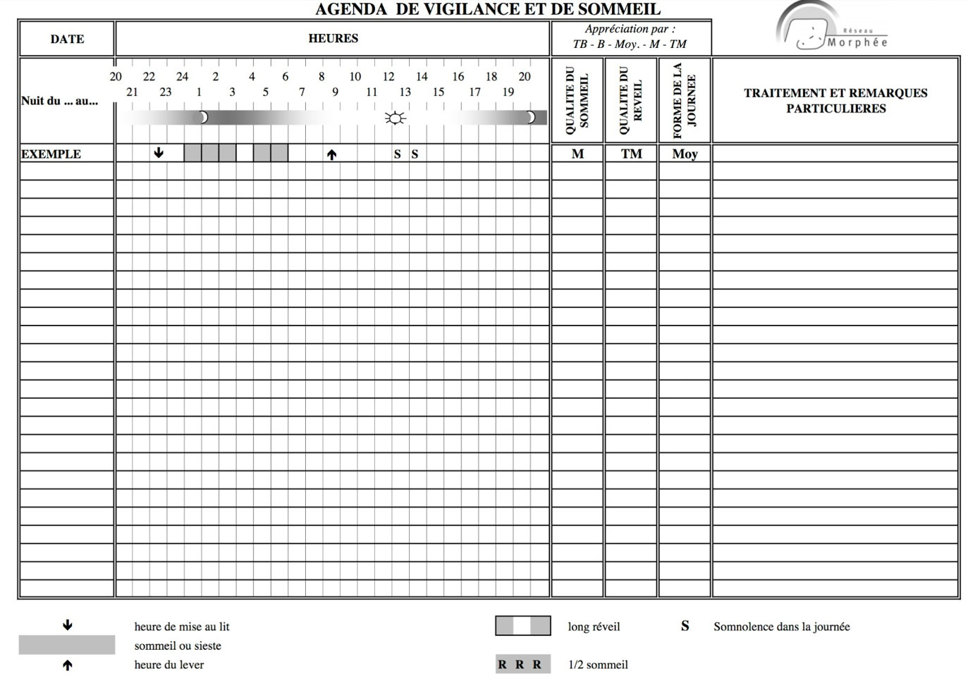 L’agenda de sommeil peut contenir des informations telles que la durée de votre éveil, la durée de votre sommeil, le temps passé au lit, les difficultés d’endormissement, les traitements que vous prenez, les insomnies, les réveils nocturnes et le sommeil diurne. Il est important de remplir l’agenda tous les jours de la semaine, car les habitudes de sommeil peuvent varier, en particulier le week-end.